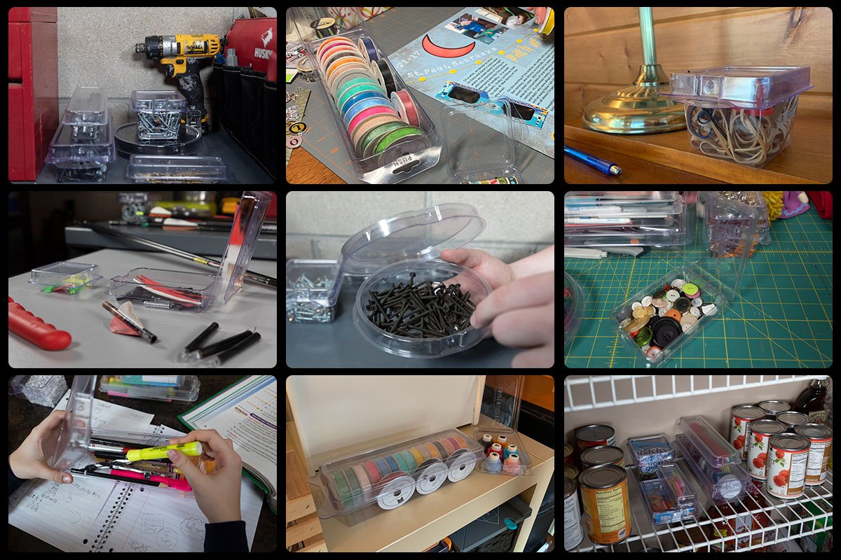 My crew and I simply fell in love with our Clamtainers. We put screws, nuts, bolts, wire nuts, you name it into them and close it with one hand and then open with one hand. We toss them into our tool belts, behind the truck seat, into the tool boxes, everyplace. One of the best things is they don't fall apart in wet weather when we get rained out and leave screws and such on the job site. No more mushed broken boxes and rusted hardware.Jeff FortnerOwner - Fortner Construction