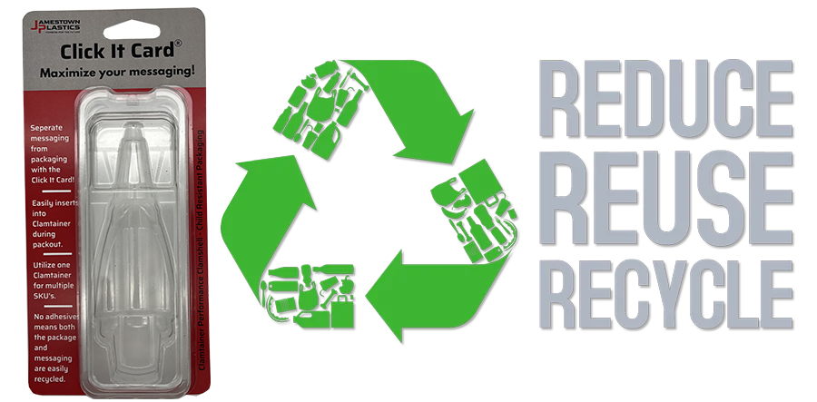 Clamshell packaging unlike any otherFrustration free – no knives or scissors needed to open Labor savings – can tremendously reduce pack-out costs No-spill secure – won’t inadvertently open if dropped Consumer reusable – doubles as a storage containerlearn More about Clamshell packaging Child-resistant packaging that is cost-effective, consumer-approvedlearn More about child-resistant packagingTHE SECRET: PatentedClick It® Closure Technology combines one-snap closing and exceptional security with one-hand openabilityTOTALLY SECURE AS A PACKAGE YET EASY TO ACCESS AS A REUSABLE CONTAINER Are you ready to see what we can do for you?Request a Quote!NO KNIVES, NOR SCISSORS OR FRUSTRATION REQUIRED TO OPENClamtainer® offers far easier opening vs. traditional clamshellsTREMENDOUS POTENTIAL PACK-OUT COST SAVINGSClamtainer® is easy to load and snaps shut; no buttons, no welding, no heat sealing, no equipment to buy or maintainKa-Bar Knives – Increased Pack Out EfficiencyI would like to thank you again on your recommendation of the 8” Clamtainer for our recent packaging needs. The innovative design and the ability to customize the shells to our needs helped solve a problem we did not know we were having. The Clamtainer has saved us many hours compared to our traditional clamshells that required a heat seal to secure. Our team has had no issues in assembling and packing out our products in the Clamtainer, with ease of use being the major benefit. I also want to thank you for the level of service that you have been providing us for many years now. Knowing that you are there to answer any questions and put to rest any concerns we may have is paramount in any working relationship. I have no problem recommending not only the Click it Clam to any company whose needs it fulfills, but also Jamestown Plastics as a whole. Thank you again for everything!Carson GumtowQuality Assurance & BuyerNO-SPILL SECUREClamtainers won’t open if dropped, as demonstrated by this penny pitch test and wrench toss testClamtainers® Ready to GoReady to give Clamtainer® a try, but want to get started quickly?We have a couple of ways that we can help:Several different Clamtainers are available in smaller quantities to ship immediately. To learn more, click here.Many different Clamtainer designs and sizes are tooled up and ready for production. If one of these designs would work for you, you could reduce or eliminate your upfront tooling cost.Examples include:Square – 2.0-3.25 inch in various depthsRectangular – widths as small as 1-inch, with lengths up to 8 inchesRound – 5.0, 5.25, and 5.75 inch diameterAmmunition containers for various calibersSpecialty containers for various productsThe best way to get started is to contact us SustainabilityOur Clamtainer® performance clamshells hit on all 3 of the R’s!Reduce – less plastic is needed compared to other packagesReuse – not Single-Use Packaging; the Clamtainer doubles as a reusable storage containerRecycle – can be made from recyclable material. Plus our Click It Card® allows for the separation of product information from packaging, increasing the ability to recycle both.Contact us today to discuss how we can work together on your sustainability / green projects!LOCK IT CLAM®When you need the utmost security for your packaging!While the ability to reopen and reuse Clamtainer® works in many situations, there are those times when a product needs more security. For those cases, use our Lock It Clam, with or without a Click It Card®.Security of a traditional clamshellMore efficient product pack-out, with no need for welding or heat sealing processes / equipmentSignificantly reduced amount of plastic needed vs. heat sealed packagesContact us to discuss how Lock It Clam® can work for your product!Made in the USAAll Clamtainer® packaging is proudly made in the USA by Jamestown Plastics™. Our dedication to customer service has fueled our growth since 1958. ADDS VALUE TO YOUR PRODUCTStay top of mind and increase your brand’s appeal with your customers, while benefiting planet earth. Clamtainer® packaging is functional even after your product is gone. Plus, it is great for storing and organizing many household and hobby-related items.Here are some examples how consumers use their repurposed Clamtainer packagingAdditional Clamtainer FeaturesGreat for elderly, disabled and arthritic customersClamtainer, packaging is easy on the hands and requires minimal strength to open and close. In addition, the audible *CLICK* ensures clams are secured, which aids the visually impaired.PatentedNo one else can offer packaging with Click It Closure Technology, because we’ve patented the closing mechanism.Better packaging stands outWhen fighting for shelf space, Clamtainer, packaging helps instantly differentiate you from your competitors.Increase Your ProductivityClamtainer, packaging does not require RF Sealing, adhesives, or mechanical fasteners to secure the package. This saves material, time, and labor by eliminating steps in the manufacturing process.BrandedWe’ll put your logo onto the faceplate of your Clamtainer, packaging, which keeps you top of mind long after your product is gone.This also presents stores or larger brands the ability to white label common goods, creating brand loyalty and repeat business.Sturdy and protectiveWe’ve dropped Clamtainer, packaging from the roof of our building in Brocton, NY. No other packaging can withstand that type of impact and still be simple to open with one hand.Fully transparent or colorful and opaqueClamtainer, packaging can be fully transparent so your product can shine through, or it can be fully opaque in almost any color.Sealing and Tamper Evident OptionsClamtainer, packaging is easy to open, but we provide many options for retail security. Contact us to discuss the best approach for your application.What manufacturers are saying…Clamtainer® helps Powell realize 90% reduction in packaging costsWhat do